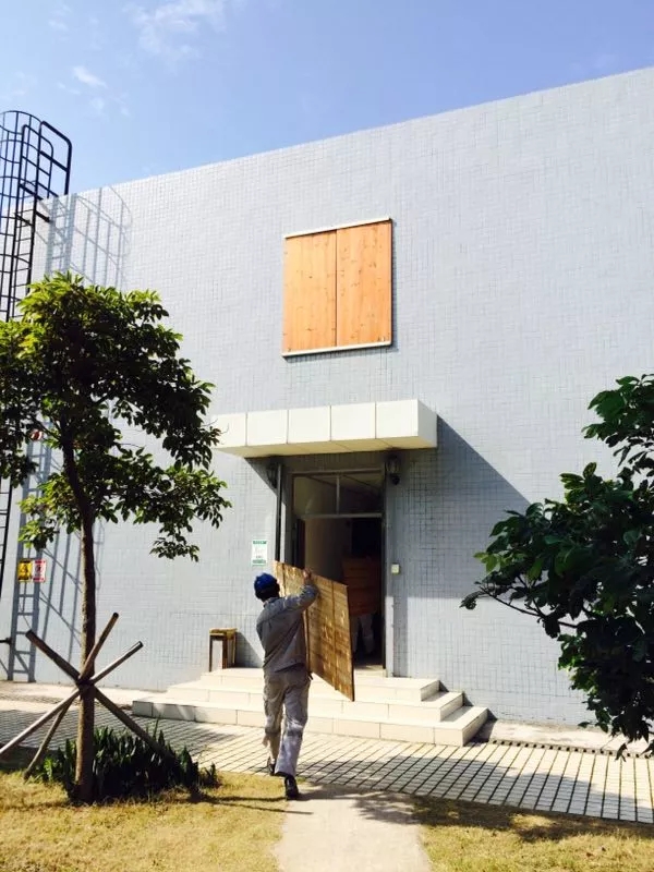 ▲臺風(fēng)登陸前夕,物業(yè)員工加固門窗,防止門窗損壞。