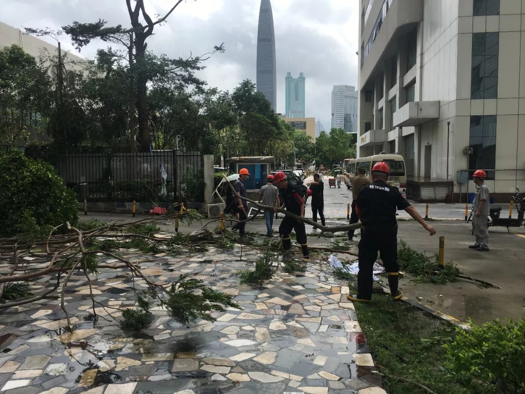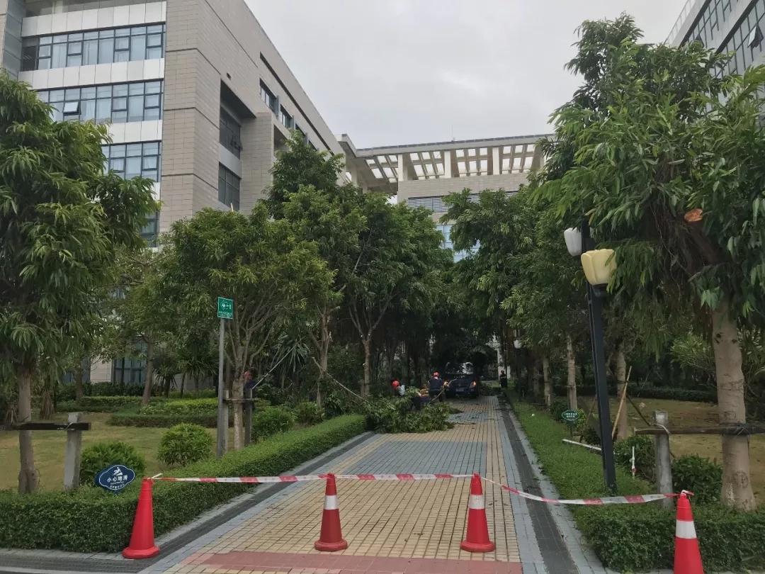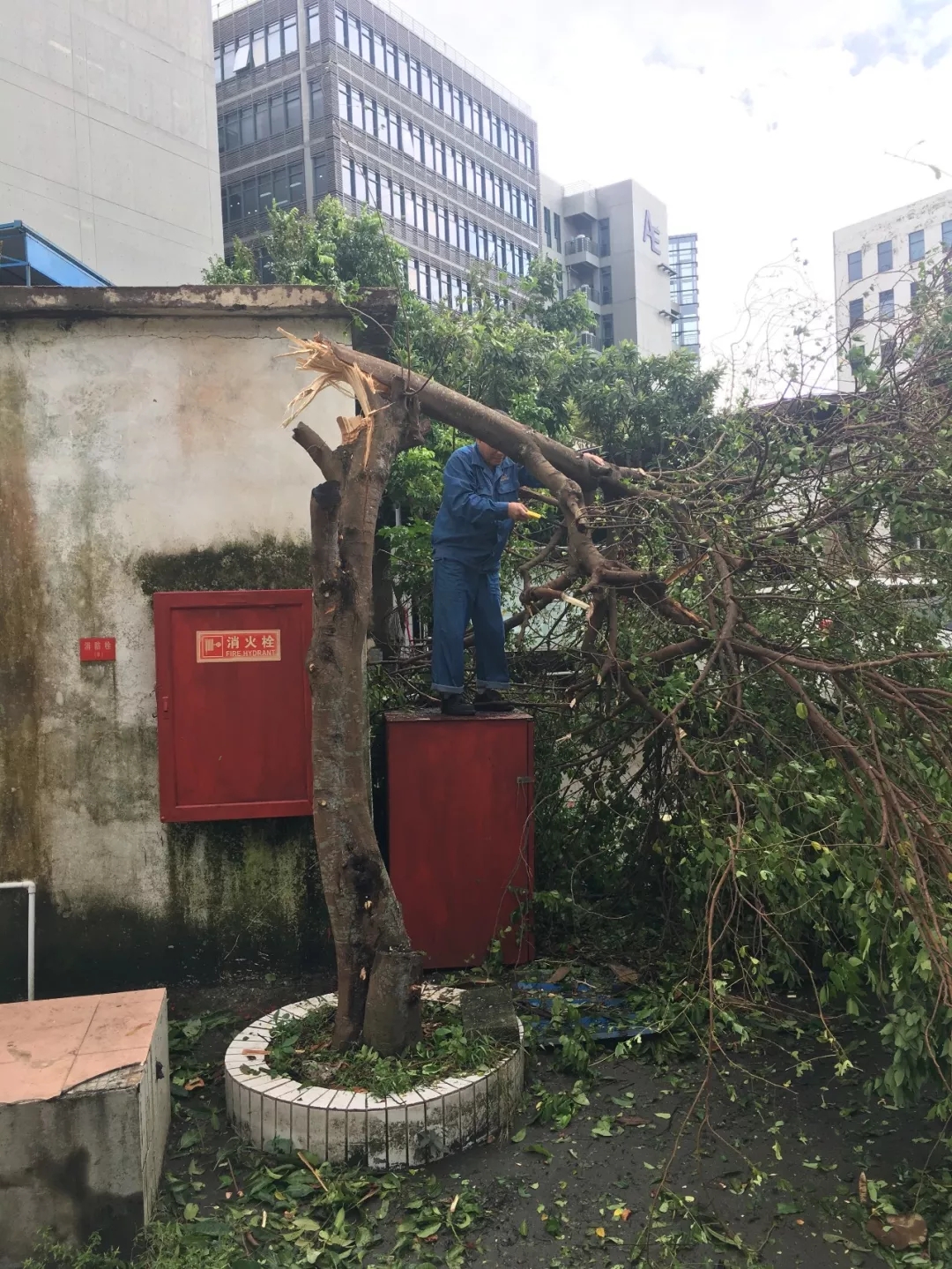▲臺風(fēng)后,陽江分公司物業(yè)員工迅速開始清理被臺風(fēng)吹倒的樹木,保障員工出行。