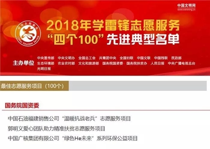 2月28日,中國(guó)文明網(wǎng)公布了2018年全國(guó)學(xué)雷鋒志愿服務(wù)“四個(gè)100”先進(jìn)典型,由中廣核服務(wù)集團(tuán)團(tuán)委和中廣核工程有限公司團(tuán)委聯(lián)合申報(bào)的“綠色He未來(lái)”系列環(huán)保公益項(xiàng)目榮獲全國(guó)2018年學(xué)雷鋒志愿服務(wù)“四個(gè)100”先進(jìn)典型中的“最佳志愿服務(wù)項(xiàng)目”。