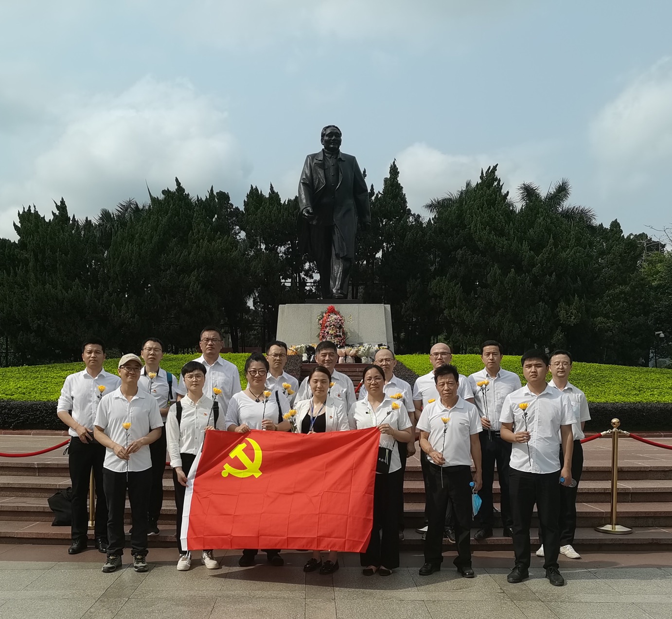 在鄧小平銅像下,大家整齊列隊(duì),集體默哀一分鐘,隨后逐一獻(xiàn)上黃菊花,并向銅像鞠躬致敬,表達(dá)對(duì)鄧小平同志的崇高敬意和深切緬懷。