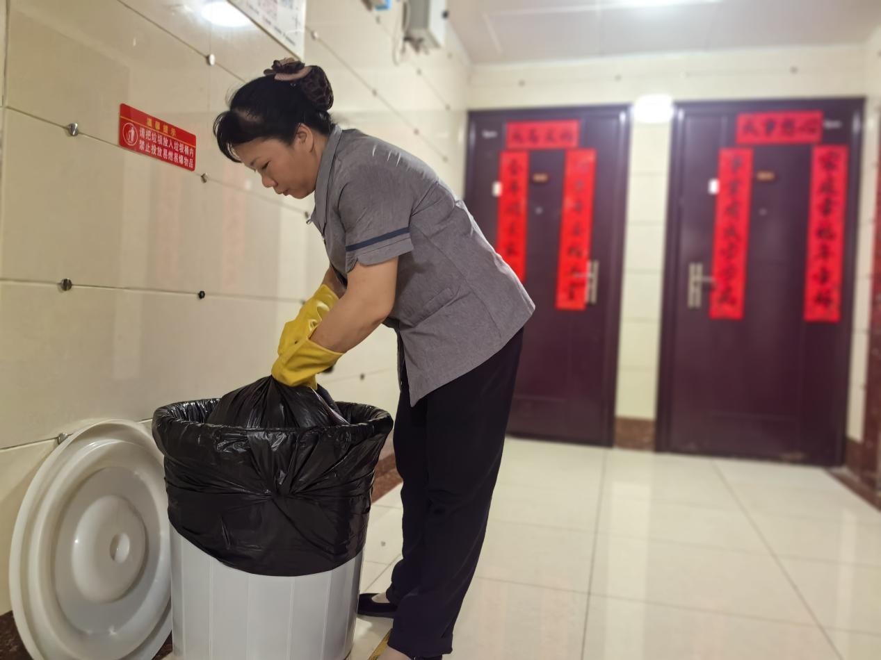 和以往任何一天一樣,迎著朝陽,市區工程服務處的保潔大姐黃仕娟早早地開始了一天的工作。黃姐的主要工作是對整棟宿舍樓每個樓層的垃圾進行收集,再裝運到小區物業的垃圾集中點以及清潔宿舍樓內的活動室、兒童樂園。雖然工作簡單重復,但她總能以飽滿的熱情,全身心投入工作,確保宿舍每個樓層垃圾不溢出,不堆積,無異味,保證每層樓道的衛生清潔,保持節日期間宿舍樓的干凈整潔。
