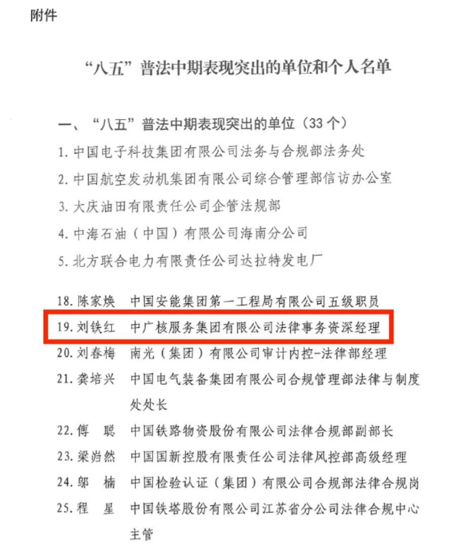 在第十一個國家憲法日來臨之際,司法部、全國普法辦聯合印發《關于通報表揚全國“八五”普法中期表現突出的單位和個人的通知》,中廣核服審計法務部劉鐵紅憑借在普法工作中的突出表現,被評為“全國‘八五’普法中期表現突出個人”。