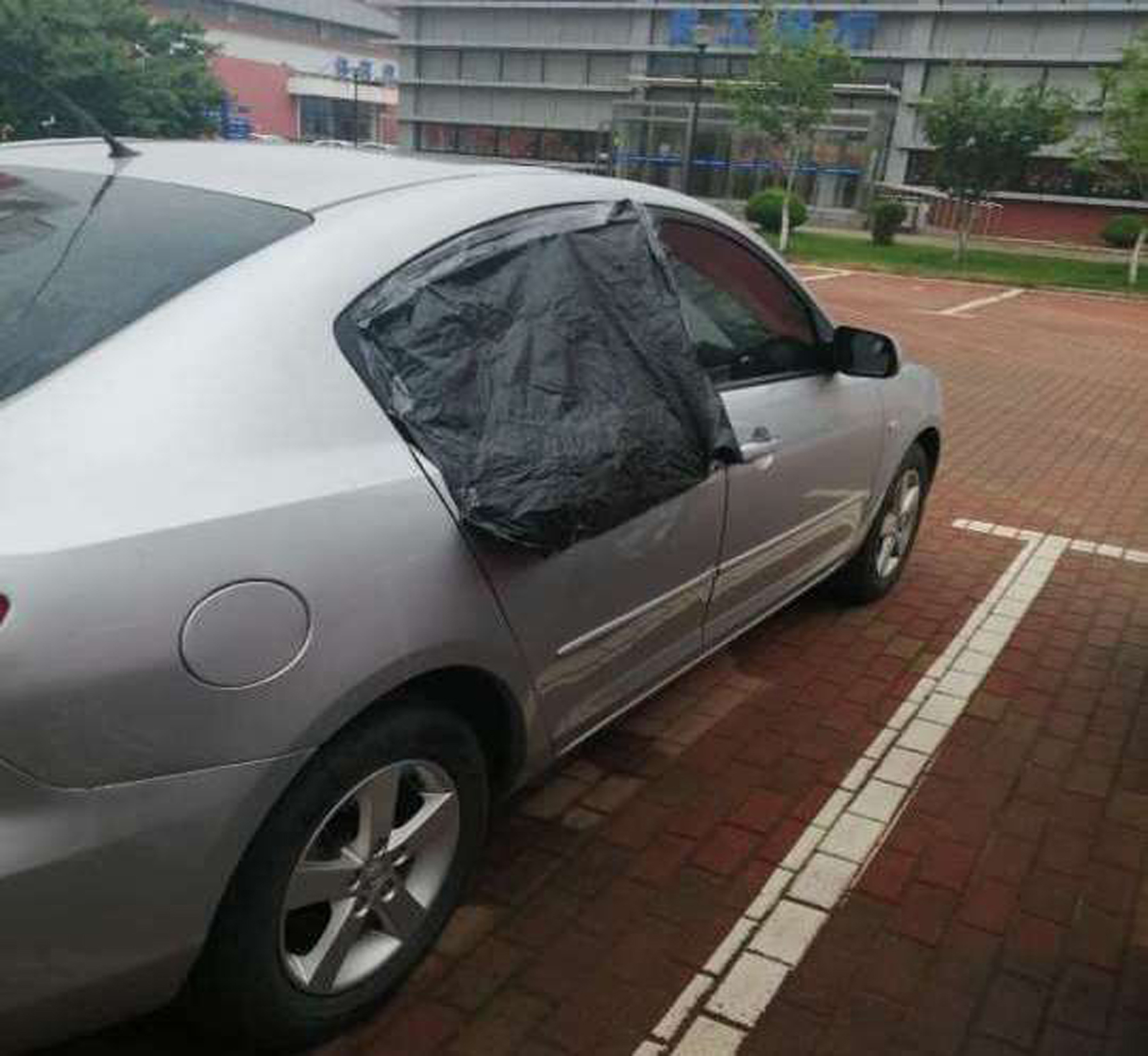 想到這里,李守玉立刻跑到車前搜尋車主電話未果,向前臺服務人員求助、說明情況尋找車主信息。前臺經聯系車主了解到車主已返回大連市區,沒辦法及時關閉車窗。在大家焦急的時候,李守玉跑了出去片刻,見他拿著透明膠帶和一塊黑色塑料布跑到車窗前,用他那粗糙有力的大手小心翼翼的粘貼著。